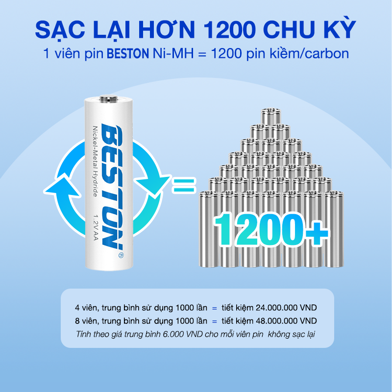 Dung lượng lớn: Sạc đầy năng lượng cho pin AA của bạn, đáp ứng mọi nhu cầu sử dụng.